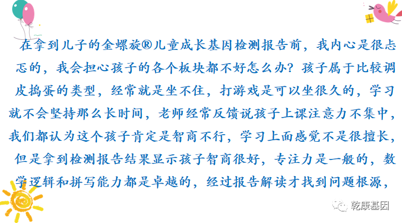 如果您还在为辅导孩子的作业焦虑抓狂,如果您还在为孩子的磨蹭、粗心大意、不爱看书等不好习惯而不知所措,您可以关注“金螺旋®家长说”,看看选择了金螺旋®儿童成长基因检测的家长们怎么说?