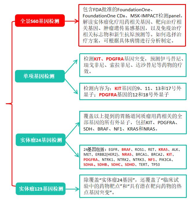 “单项基因检测”包括KIT基因(9、11、13和17号外显子)和PDGFRA基因(12和18号外显子)。