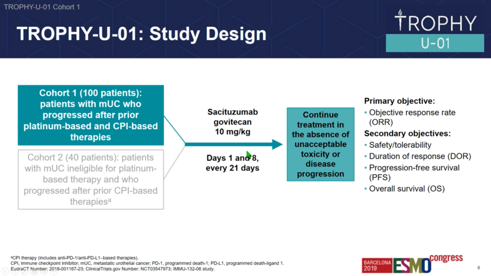 2019年ESMO大会发布的开放性II期TROPHY-U-01临床试验中,研究人员评估了2个队列中的sacituzumab govitecan:接收含铂化疗和检查点抑制剂后进展的转移性尿路上皮癌患者(n = 100;队列1),以及不符合含铂化疗资格,预先接受检查点抑制剂治疗后进展的患者(n = 40;队列2)。[3]