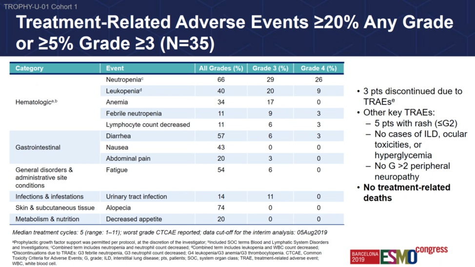 中期分析结果是基于研究人员根据RECIST v1.1标准对队列1进行的数据评估。患者每3周的第1天和第8天以10 mg / kg的剂量接受sacituzumab govitecan治疗,直至出现不可耐受的毒性反应或疾病进展时停止治疗。主要终点是ORR;次要终点是安全性/耐受性,缓解持续时间DOR,PFS和OS。纳入中期分析的35例患者接受了至少一个周期的sacituzumab govitecan治疗,并接受了至少一次治疗反应评估。