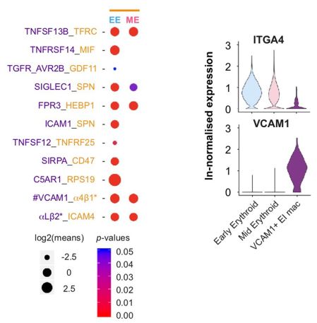 图8 VCAN1+ EI巨噬细胞(紫色)和两个红系细胞群(黄色)富集的受体-配体相互作用的显著性(a),以及这些细胞VCAM1和ITGA4的表达水平小提琴图(b)。其中,EE是早期红系细胞,ME是中期红系细胞,EI是幼红细胞岛【5】。