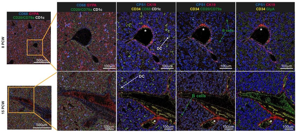 接着,研究者使用质谱流式成像评估红系细胞、肥大细胞、髓样和淋巴样细胞的空间分布,发现8-15周时肝脏结构变化显著: