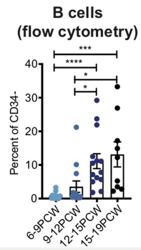 ❖ 发育早期,CD1c+ DC(树突状细胞)和B细胞系的CD79a+CD20+细胞分布稀疏(图6)。