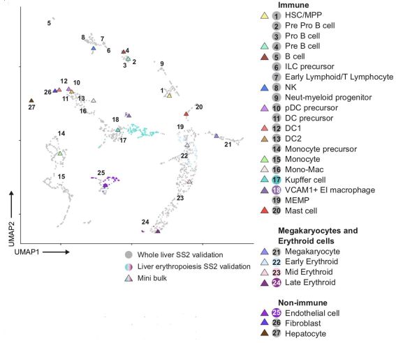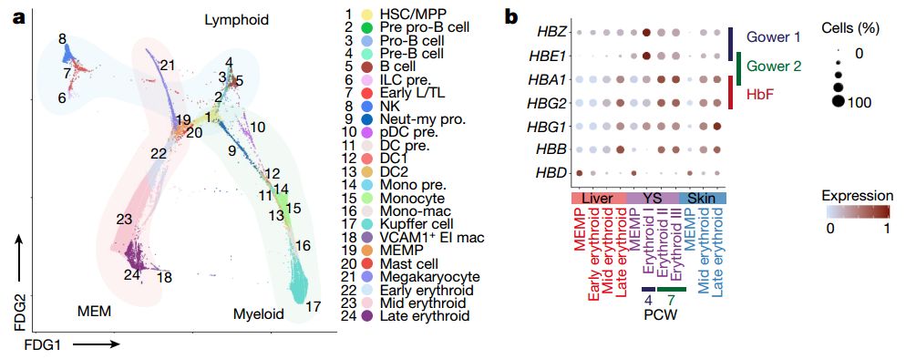对于人类,胎儿骨髓在11周左右定植,20周后成为主要的造血部位【4】。为了研究发育早期血液和免疫系统的发展情况,即发育早期胎肝的造血作用,研究者使用单细胞RNA测序技术分析了近140,000个7-17周人类胎肝细胞,以及74,000个皮肤、肾脏和YS细胞,完整的构建了胎肝造血作用图谱。