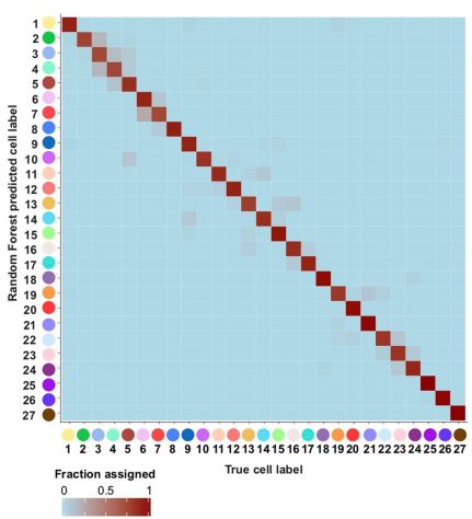为了确认单细胞转录组数据分析得到的细胞聚群和差异表达基因集,研究者使用随机森林分类法(Random Forest classifier)验证48个DEGs的预测能力,发现平均准确率在89%(图4)。