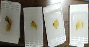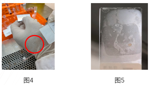 图4中载玻片上只有三个笔尖大小的点点,这种属于组织样本量极少。需采样人员尽量如图5所示取样,或者除上述要求的切片数量额外多加几片。