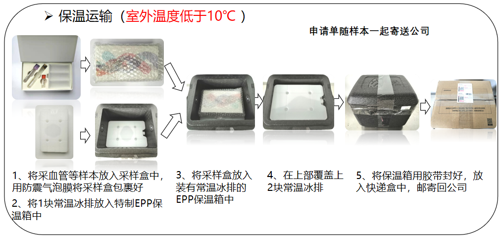 室温在10℃以下的常温运输,室温在10℃及以上的需加冰袋运输,冰袋务必不要直接接触保存管。