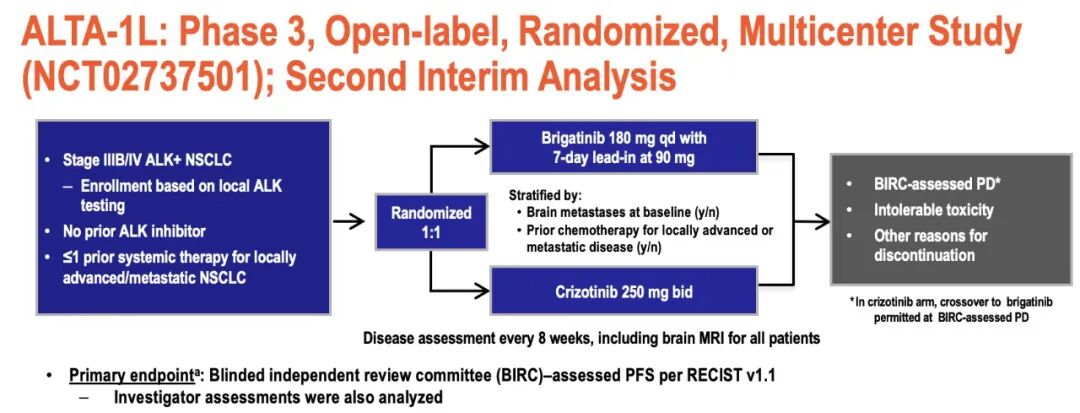 在这项国际化,开放性,比较性,多中心III期ALTA-1L试验中,研究人员比较了brigatinib与crizotinib在275例预先未接受过ALK抑制剂治疗的IIIB / IV期ALK阳性NSCLC患者中的疗效和安全性。